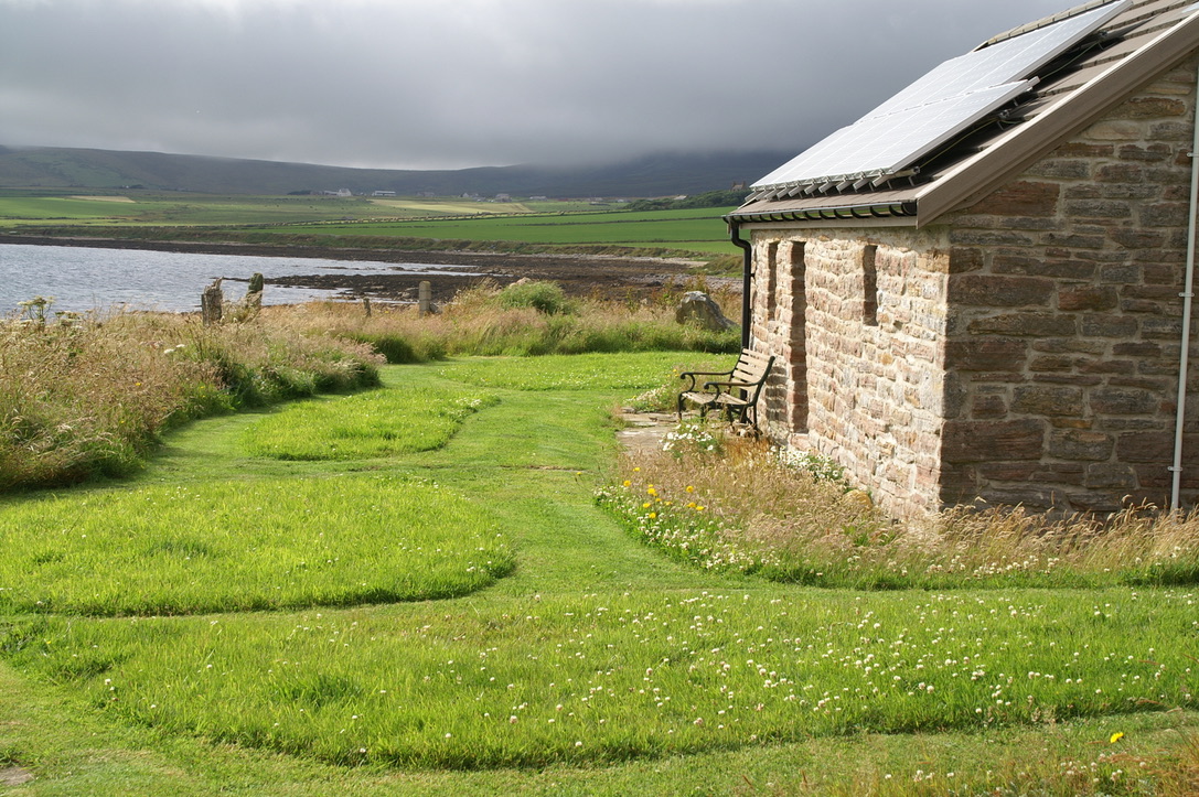 It can be seen from across Swanbister Bay, on the left of the 2 houses in the foreground